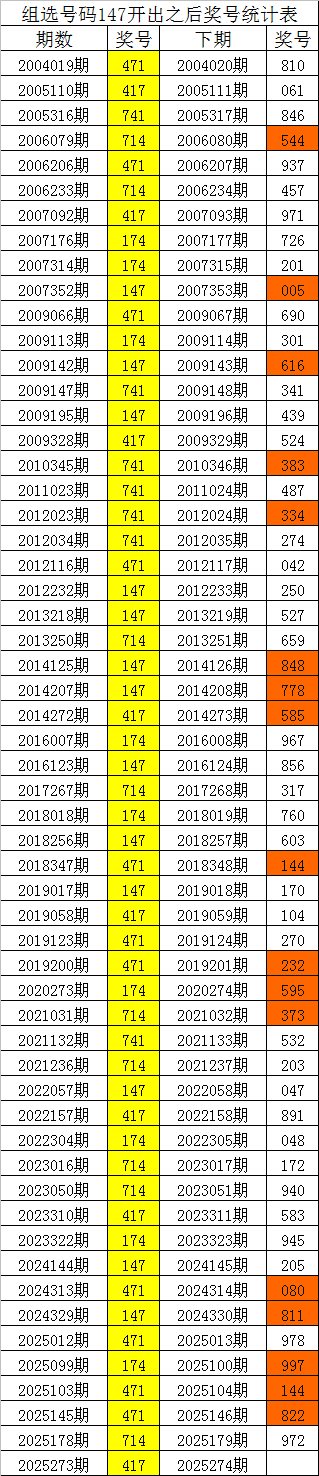体彩摆设三组选号码147历史上出现了57次,其下期奖号离别为:810、061、846、544、937、457、971、726、201、005、690、301、616、341、439、524、383、487、334、274、042、250、527、659、848、778、585、967、856、317、760、603、144、170、104、270、232、595、373、532、203、047、891、048、172、940、583、945、205、080、811、978、997、144、822、972,详备统计见下表: