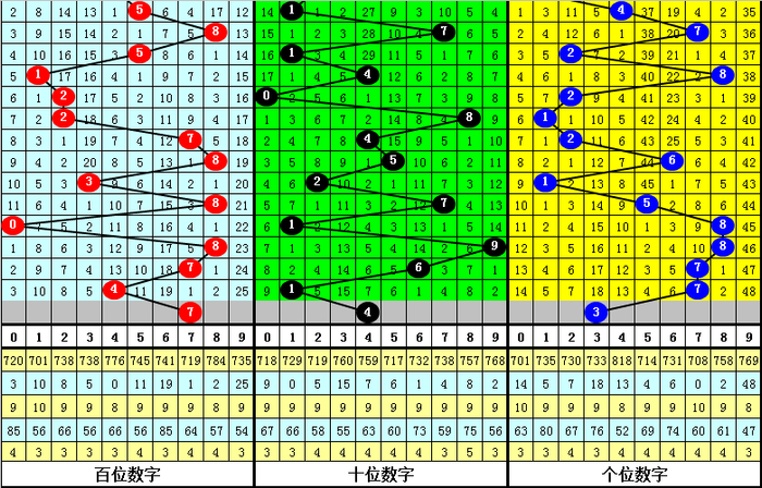 百位号码奇偶比为5:2,奇数号码透露相对较热,本期展望奇数号码再出;大小比为5:2,大号走势较热,本期看强大号再次出现。