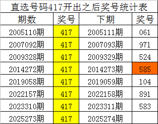 从上表统计不错看出,直选号码417开出之后,其下期奖号: