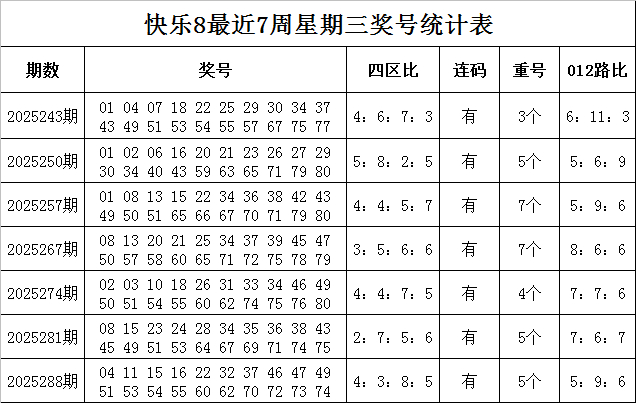 012路比:最近7周星期三012路奖号分别出现43个、54个和43个;最近3周星期三012路奖号分别出现19个、22个和19个;上周星期三012路奖号出现个数分别为5个、9个和6个。